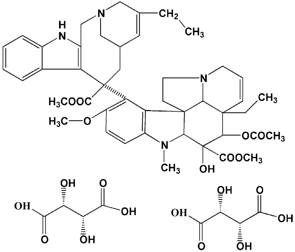 Vincristine, vinblastine and vinorelbine (VLB), three kinds of vinca alkaloids, represent one of the most widely used classes of antineoplastic agents [1]. Their cytotoxicity against cancer is based on their ability to inhibit the dynamics and assembly behavior of microtubule during the metaphase, and cell growth is arrested during metaphase [2,3]. VLB (5'-nor-anhydrovinblastine), a semisynthetic vinca alkaloid that differs from other vincas by a modification of the catharanthine moiety, exhibits a broader spectrum of anti-tumor activity and reduced neurotoxicity compared to the naturally occurring vincas [4]. The highest activity of this drug has been proven in patients with non-small-cell lung cancer (NSCLC) [5,6,7] and advanced breast cancer (ABC) [8,9,10]. It is currently registered for the treatment of ABC and NSCLC in most countries [11]. An injectable formulation of VLB (Navelbine® IV), which mainly consists of vinorelbine tartrate (VLBT) (Figure 1) developed by Pierre Fabre Medicament France, is now widely marketed for the treatment of two kinds of diseases in many countries [12,13,14,15,16]. However, short-duration and non-cumulative granulocytopenia are the major dose-limiting toxicities, and other side effects, such as nausea and vomiting, constipation, peripheral neuropathy and reversible alopecia, can occur as well, but are generally mild [17]. Moreover, Navelbine® IV is not an optimal drug delivery system because of its vesicant action. It is very well known that this action tends to cause venous irritation and phlebitis when Navelbine® IV is directly administered intravenously as an aqueous solution. Venous irritation is reported as injection site reactions, local reactions, and superficial phlebitis, whereby the symptoms include erythema, pain at the injection site, vein discoloration and tenderness along the vein [17]. Thus, it is necessary to find a new strategy to reduce the venous irritation produced by aqueous injections of VLB. A stable oral dosage form of VLB (Navelbine® Oral), a soft gelatin capsule filled with VLB ditartrate/ethanol/water/glycerol/macrogol 400 solution, which was developed in 1994 by Pierre Fabre Medicament, is also available on the market [18]. The advantages of the oral formulation chemotherapy development are patient pharmaco-economic issues, patient preference and cost savings compared to i.v. administration [19,20]. However, the severity of the side effects caused by the oral administration caused was greater than with the i.v. form.