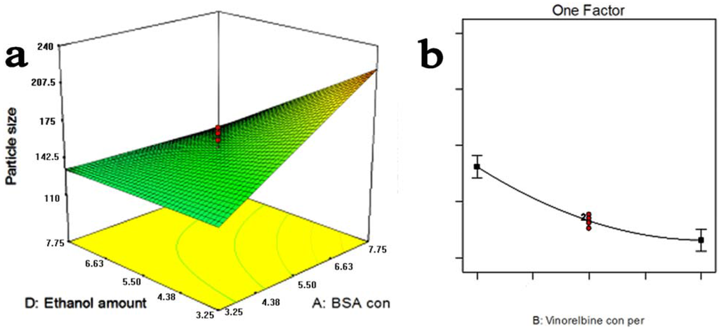 (a) Response surface plots for mean particle size of the vinorelbine tartrate loaded bovine serum albumin nanoparticles (VLBT-BSANPs) showing interaction between bovine serum albumin (BSA) concentration and the ratio of ethanol and VLBT solution (v/v); (b) Response surface plots for drug loading efficiency (DLE) of the VLBT-BSANPs.