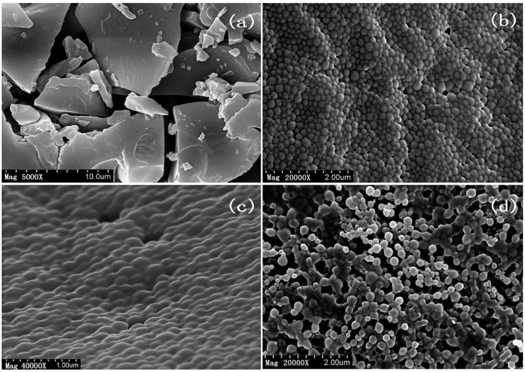 Scanning electron microscopy (SEM) image of raw VLBT and VLBT-loaded nanoparticles. (a) Raw VLBT; (b) VLBT-BSANPs; (c) Fa-BSANPs-VLBT; (d) Fa-BSANPs-VLBT with mannitol.