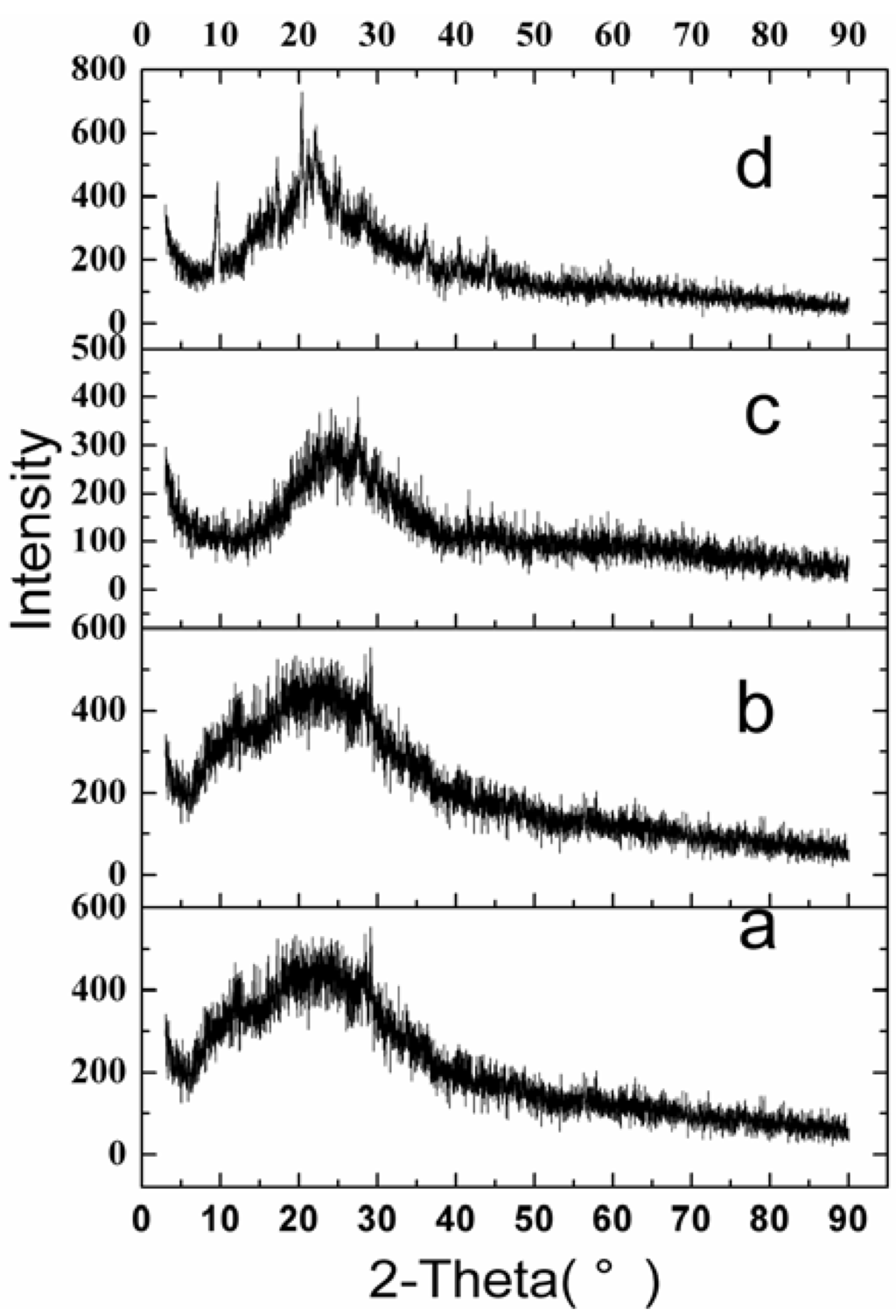 X-ray diffraction (XRD) patterns of raw VLBT and VLBT-loaded nanoparticles. (a) Raw VLBT; (b) VLBT-BSANPs; (c) Fa-BSANPs-VLBT ; (d) Fa-BSANPs-VLBT with mannitol.