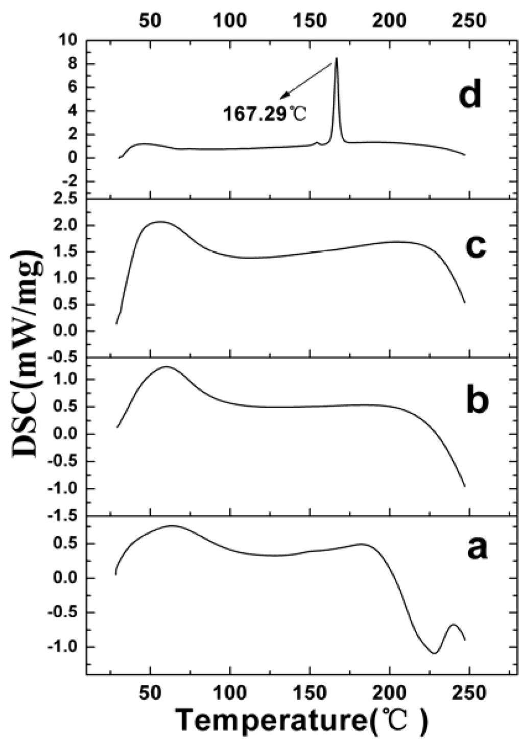 Differential scanning calorimetry (DSC) patterns of raw VLBT and VLBT-loaded nanoparticles. (a) Raw VLBT; (b) VLBT-BSANPs; (c) Fa-BSANPs-VLBT ; (d) Fa-BSANPs-VLBT with mannitol.