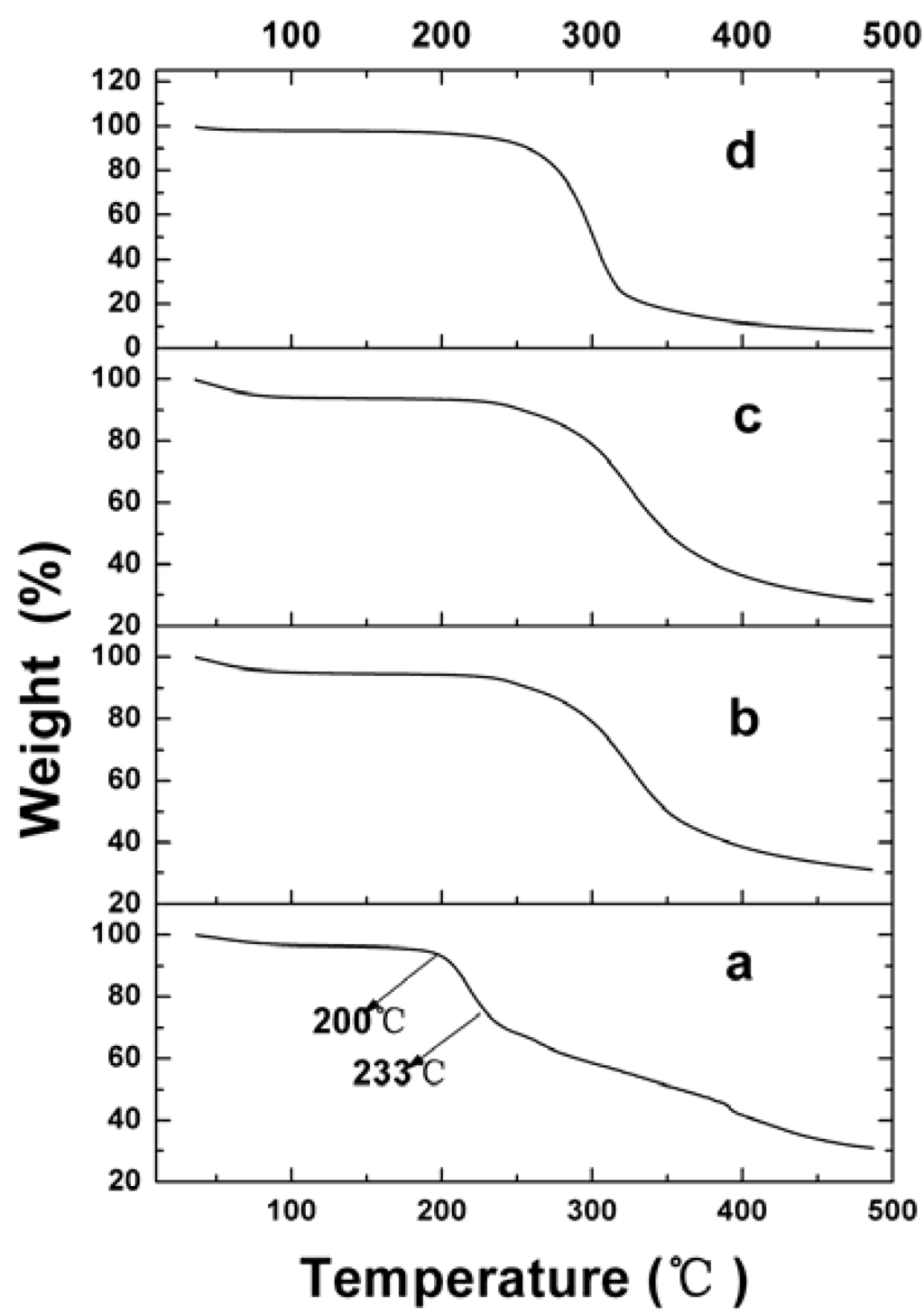 The thermal stability of samples was also tested with a thermogravimetric analyzer (TGA, Diamond TG/DTA Perkin-Elmer, USA). During the course of testing, the samples weighing 2–3 mg were heated at a fixed heating rate of 10 °C /min from 35 to 500 °C under a nitrogen purge.
