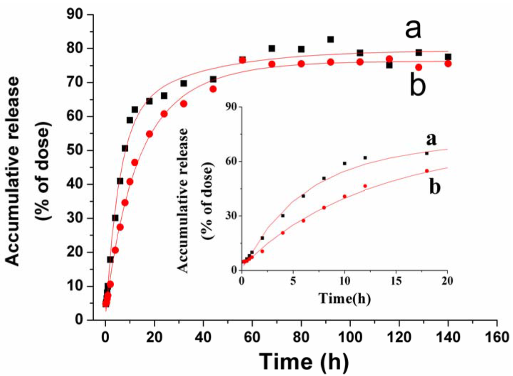 The release profiles of raw VLBT and Fa-BSANPs-VLBT with mannitol. (a) Raw VLBT; (b) Fa-BSANPs-VLBT with mannitol.