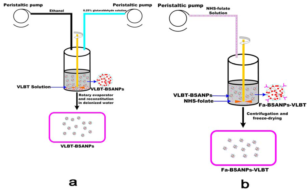 Schematic description of the preparation procedure of Fa-BSANPs-VLBT: (a) VLBT-BSANPs were produced with a desolvation technique; (b) VLBT-BSANPs powder was reconstituted in deionized water, followed by the addition of the NHS-folate solution with a peristaltic pump, NHS-folate was first dissolved under alkaline conditions.