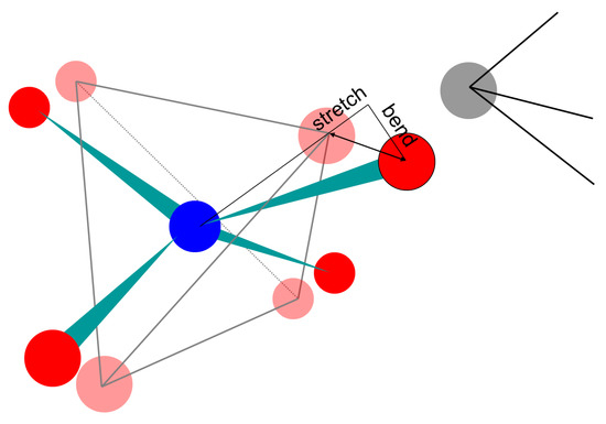 As the mismatches can be resolved into bond-bending and bond-stretching components, these components can be assigned separate harmonic constraints and need not have the same spring constant. The simulation calls for the specification of spring constants for bond-bending and bond-stretching for each polyhedral type. In the method’s most common application, to silicate zeolite frameworks, we typically assign values of 5 and 20 arbitrary units as the spring constants for bond-bending and bond-stretching distortions of the SiO tetrahedra, based on the relative frequencies of the corresponding modes of vibration observed experimentally in SiO structures [11,12,13]. The simulation also requires a steric radius for each element present, and a spring constant. We typically treat steric clashes as being as disadvantageous as bond stretching and assign a spring constant of 20 arbitrary units to all overlaps. The most significant radius for zeolite frameworks is that of the tetrahedral oxygen atoms, for which we use a standard radius of Å [14]. The elements of the force model for geometric simulation are illustrated in Figure 3.