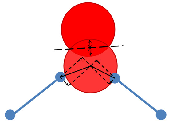 Force model for geometric simulation. The oxygen atom at the centre of the diagram is in steric contact with a nearby atom (above) and is connected to two template vertices to right and left. The mismatch of the atom from a template position is resolved into bond-stretching and bond bending components. Harmonic penalties apply to the bond-bending distortions, bond-stretching distortions, and steric overlap of atomic spheres.
