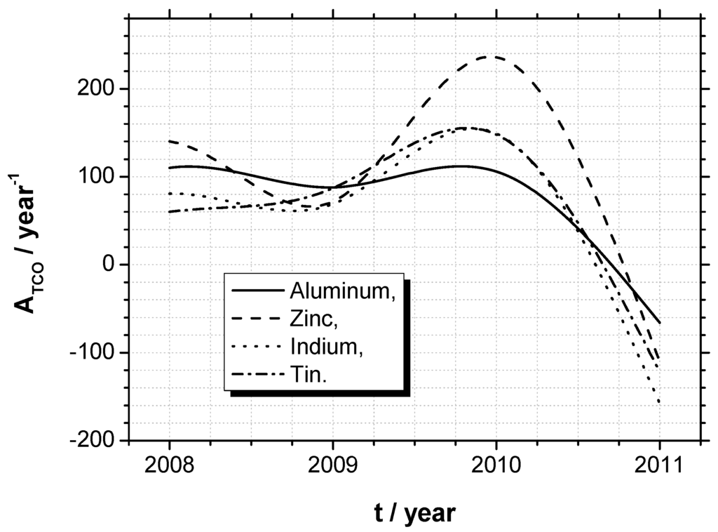 Therefore, technical advances in transparent conducting oxides may be illustrated researching the web of knowledge (Thomson Reuters). Applying e.g., the search item “TCO < name of element > oxide” leads to the carefully selected citation statistics, shown in Table 2. Again, the already discussed elements aluminum (Al), zinc (Zn), indium (In) and tin (Sn) show the by far highest nominal citation impacts. In order to demonstrate the technical advances in transparent conducting oxides, the gradient of citations over the years 2007 until 2011 shall be printed for these four elements in Figure 1. This indicates, that the focus of investigation was preferably set on ITO and that ATCO rises until 2010 by about 100 a year. Until 2011, the number of citations per year decreases—not only because this literature research was done in November 2011.