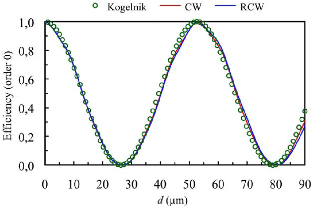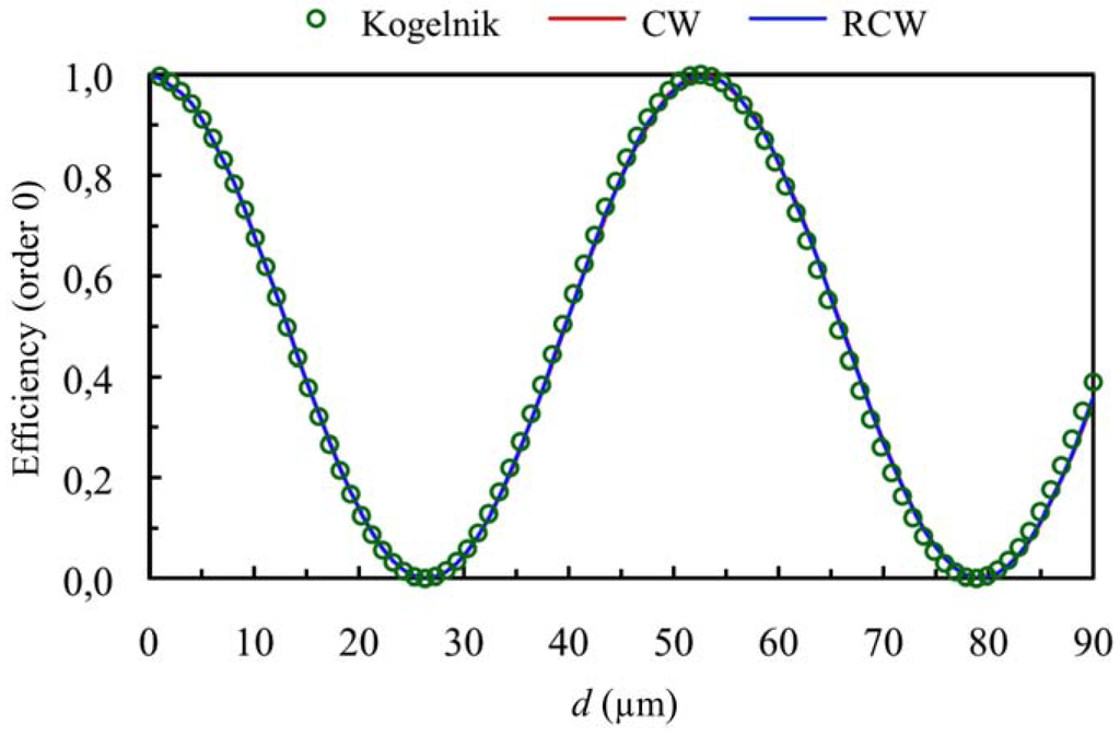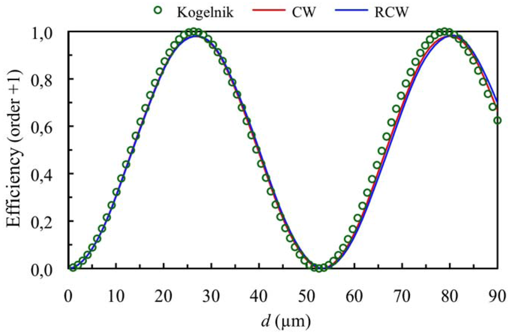 When higher values of the spatial frequency are considered (500 lines/mm) the values of the parameter Ω are higher than 5 (Ω = 6.2). The efficiencies of the orders +1 and 0 as a function of the thickness of the grating are represented in Figure 6 and Figure 7, respectively when high values of the index modulation are considered (n1 = 0.011). In these figures there is good agreement between the CW and RCW theories, but the results obtained by using Kogelnik Coupled Wave Theory slightly deviate from those of RCW and CW theories. This is due to the existence of multi-order diffraction, although the results are clearly closer than in the case of 350 lines/mm.