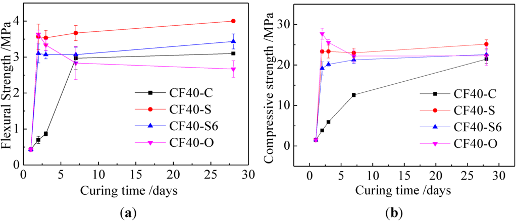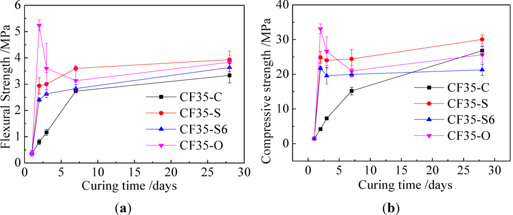 For Class C fly ash geopolymer mortar with water to ash ratio of 0.35 (CF35-C), Figure 1a,b showed the effect of curing conditions on their flexural and compressive strength, respectively. Before the age of 7 days, the non-standard curing resulted in much higher strength than the standard curing. After steam curing for 24 h and 6 h (CF35-S and CF35-S6), strength increased rapidly at the age of 1 day, then strength developed slowly. The compressive strengths corresponding to steam curing for CF35-S6 and CF35-S were 21.75 MPa and 24.87 MPa, respectively. Those values were 5.2 times and 5.9 times as much as that after standard curing for CF35-C, respectively. The compressive strength of geopolymer mortar cured in the oven (CF35-O) for 2 days increased to the maximum value then shut down later, and compressive strengths were 33.1, 26.62, 20.98 MPa at the ages of 2, 3, 7 days, respectively, which were 7.9, 3.6, 1.4 times correspondingly as much as compressive strength under the standard curing. After 7 days, the strength of non-standard cured specimens was comparable or even lower than those from standard curing, the corresponding compressive strengths (CF35-S and CF35-S6) were 21.27 MPa and 30.05 MPa at the age of 28 days, just 0.8 times and 1.1 times as much as that under standard curing, respectively. With higher water to ash ratio, a similar phenomenon was observed. From Figure 2, for the mass ratio of water to fly ash at 0.40 geopolymer mortar (CF40), the strength development had similar to the geopolymer mortar at W/F 0.35. However, the 28-day strength was lower than that of CF35. In summary, for the Class C fly ash geopolymers investigated in this study, these non-standard curing conditions resulted in higher early age (7 days) strength, while the standard curing was beneficial to longer-term strength development.