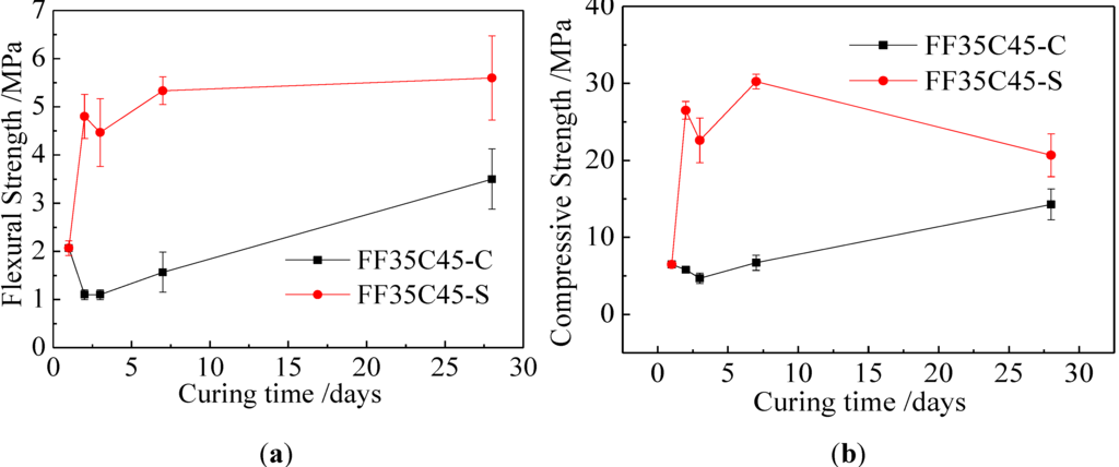 The effects of curing conditions on the strength of Class F fly ash mixed with calcium hydroxide geopolymer mortar were shown in Figure 3. The compressive strength and the flexural strength of geopolymer mortar after being demolded cured at standard temperature for 1 day were up to 6.48 MPa and 2.07 MPa. These high strengths were attributed to the addition of Ca(OH)2 which enhanced the concentration of OH− to dissolve the Class F fly ash. The compressive strength decreased in the first 3 days and then increased up to 14.28 MPa at the age of 28 days under standard curing. Under the steam curing conditions, the compressive strength fluctuated during the curing period and compressive strength reached the maximum value of 30.23 MPa at the age of 7 days. Steam curing provided higher strength than standard curing for geopolymer mortars of Class F plus Ca(OH)2.