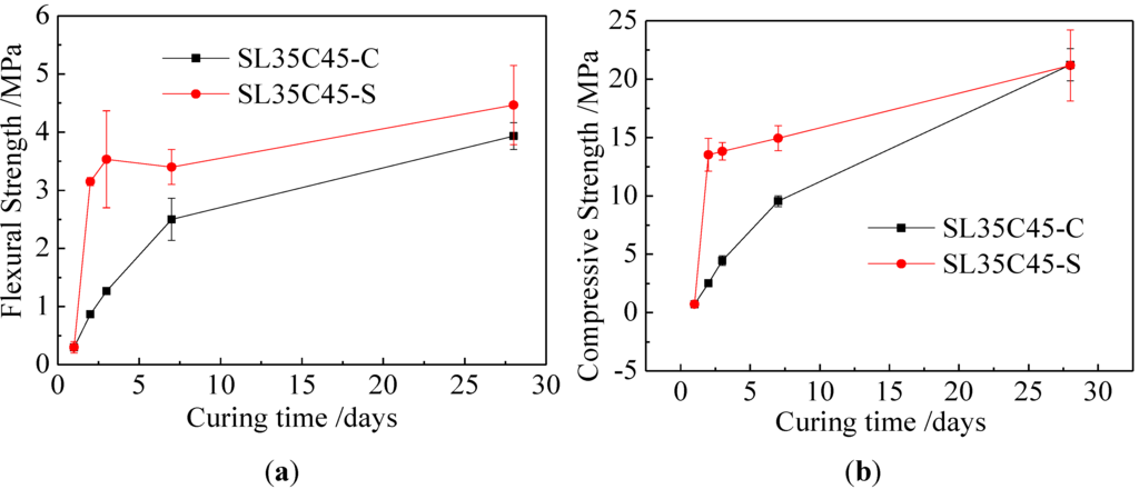 The effect of curing conditions on the strength of Class F fly ash with slag geopolymer mortar was shown in Figure 4. In this Figure 4b, the compressive strength of geopolymer mortar prepared by Class F fly ash and slag increased with the increase of curing time under standard curing and steam curing. Besides, the flexural strength under standard curing conditions showed a similar trend. Under steam curing conditions (seen in Figure 4a), both the 3-day and 28-day flexural strengths were higher than those under standard curing conditions, athough the difference of the 28-day strength was negligible. These results indicated that the steam curing increased the early strength of Class F fly ash-slag geopolymer mortar.
