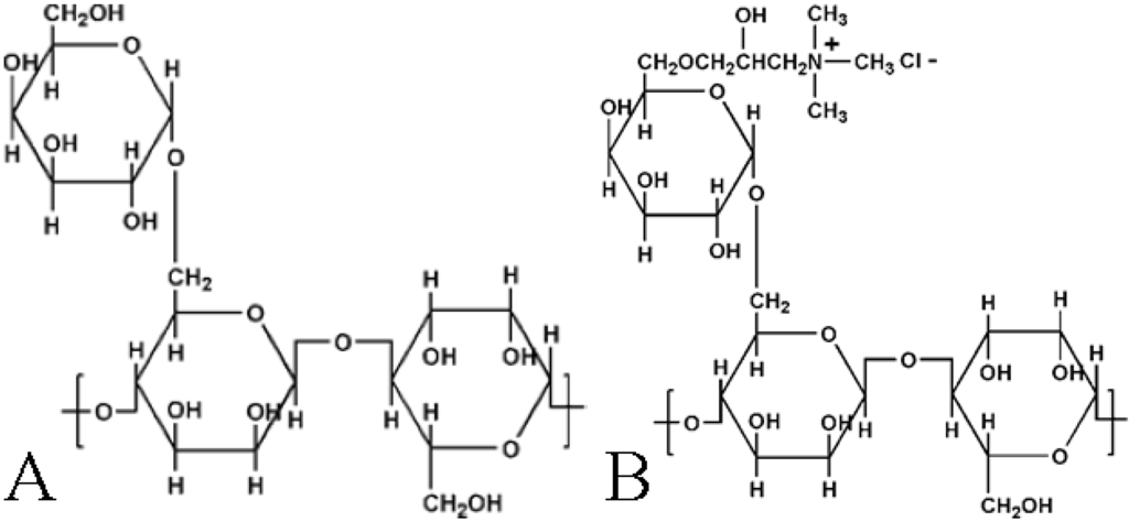 Guar Gum is a galactomannan polysaccharide obtained from the endosperm of the seed of Cyamopsis tetragonoloba [27,28]. This gum consists of a backbone of (1–4) β-D-manno-pyranosyl units with every second unit bearing an (1–6) α-D-galacto-pyranosyl unit (Figure 1A). Guar Gum is a high molecular weight polysaccharide with a previous study indicating the molecular weight as between 800 and 5000 kDa [29]. Guar hydroxypropyl trimethyl ammonium chloride (Figure 1B) is a quaternary ammonium derivative of guar gum [27]. Guar gum and the modified forms are predominantly used in the food industry [30].