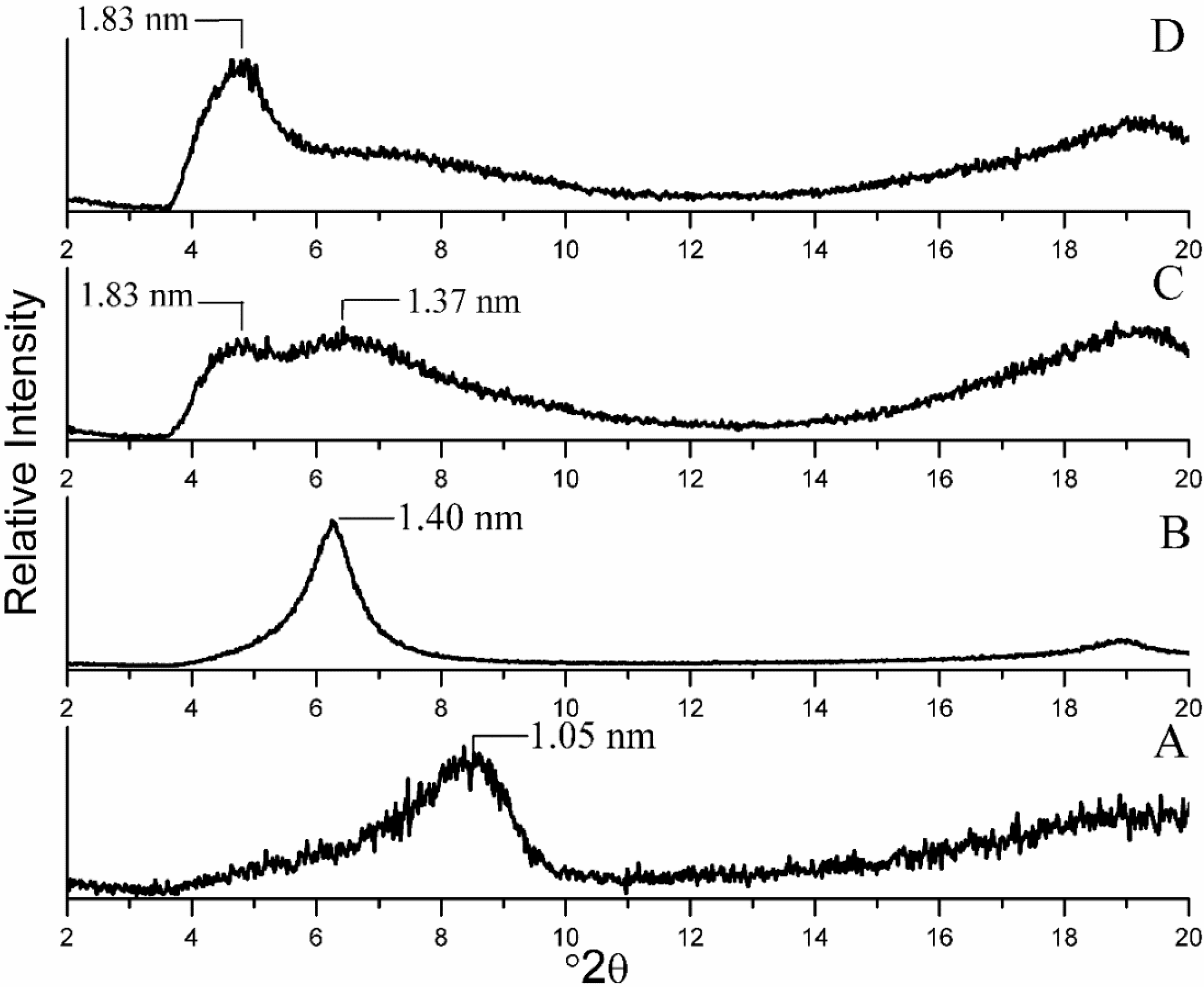 X-ray diffraction (XRD) patterns of (A) Na+ mineral montmorillonite (MMT); (B) CG-MMT 3:1; (C) NG-MMT 3:1; (D) NG-MMT 6:1.