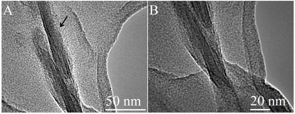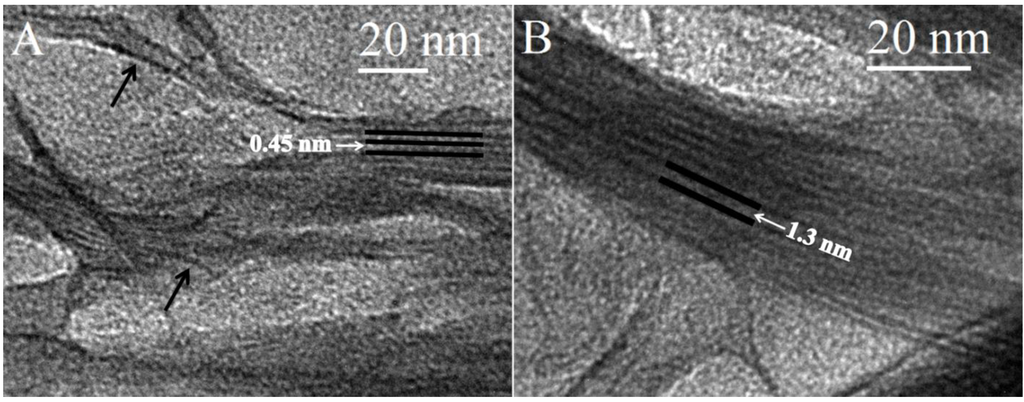TEM imaging was used to elucidate the morphology of the nanocomposites. Staining of the samples was unrequired due to the high electron density difference between clay and polymer [37]. The images acquired of CG-MMT 3:1 (Figure 3) displayed stacks with an average length of 10–25 nm. The length of the stacks of the nanocomposite were smaller than those observed in the images of Na+ MMT (Figure 6), indicating that the clay layers dispersed into smaller stacks in the polymeric matrix of cationic guar gum [38]. Curvature of the clay platelets, noted in literature with other nanocomposites, was also observed in the images of CG-MMT 3:1 (black arrows on Figure 3A) [39,40]. In Figure 3A, the clay layers of the stack appeared as dark lines bordering interlayer spaces that measured an average of 0.45 nm, in agreement with the XRD results which depicted an intercalated structure with the same average interlayer space. While the peak maximum of the 001 reflection for CG-MMT 3:1 represented an interlayer space of 0.45 nm, Figure 3B displayed a stack of clay layers where an interlayer space of approximately 1.3 nm was measured. This greater expansion of the interlayer space remained in agreement with XRD results, considering that the peak that corresponded with the 001 reflection of CG-MMT 3:1 was broad and encompassed a range of d-spacing values, including 1.3 nm. Thus, the TEM results were in good agreement with XRD results; nonetheless, as reported previously by another study, an XRD-acquired value for the interlayer spacing of a nanocomposite composed of intercalated and exfoliated regions does not represent a discrete, actual value for the expansion of the clay layers, but was an average value of the mixed morphologies [38].