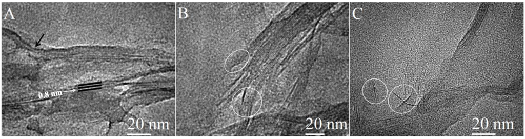 TEM images of NG-MMT 3:1 (Figure 4) indicated clay layers aligned in a parallel manner and stacked together in domains with varying sizes, ranging from approximately 5 nm to 40 nm, validating the intercalation effect inferred from XRD results. The interlayer space was measured from several of the images obtained and was found to be in the range of 0.45–0.85 nm. A clay stack with interlayer space of 0.8 nm can be observed in Figure 4A. The measured range of values of the expansion of the interlayer space was as expected, based on the intermediacy of the structure of NG-MMT 3:1, depicted by the XRD results, and the nature of XRD-derived results in presenting average values of the d-spacing. Curvature of the clay layers was also observed in the case of NG-MMT 3:1 (black arrow on Figure 4A). Smaller stacks of clay than those present in Na+ MMT are observed in NG-MMT 3:1, an example of which was observed in Figure 4A, where a stack consisted of only three clay layers, in contrast to the larger stack observed in the image of Na+ MMT (black arrow on Figure 6A). Moreover, detachment of the clay layers in two regions are observed, whereby a smaller stack of clay appeared to be in the early stages of breaking off or segregating from the parent stack of clay (circled on Figure 4B), evidence of the concurrent exfoliation effect present along with the intercalated morphology. Upon close inspection of Figure 4C, the presence of single clay mineral layers was observed (circled), indicating the individual dispersion of the exfoliated sheets in the polymer matrix [38,39].