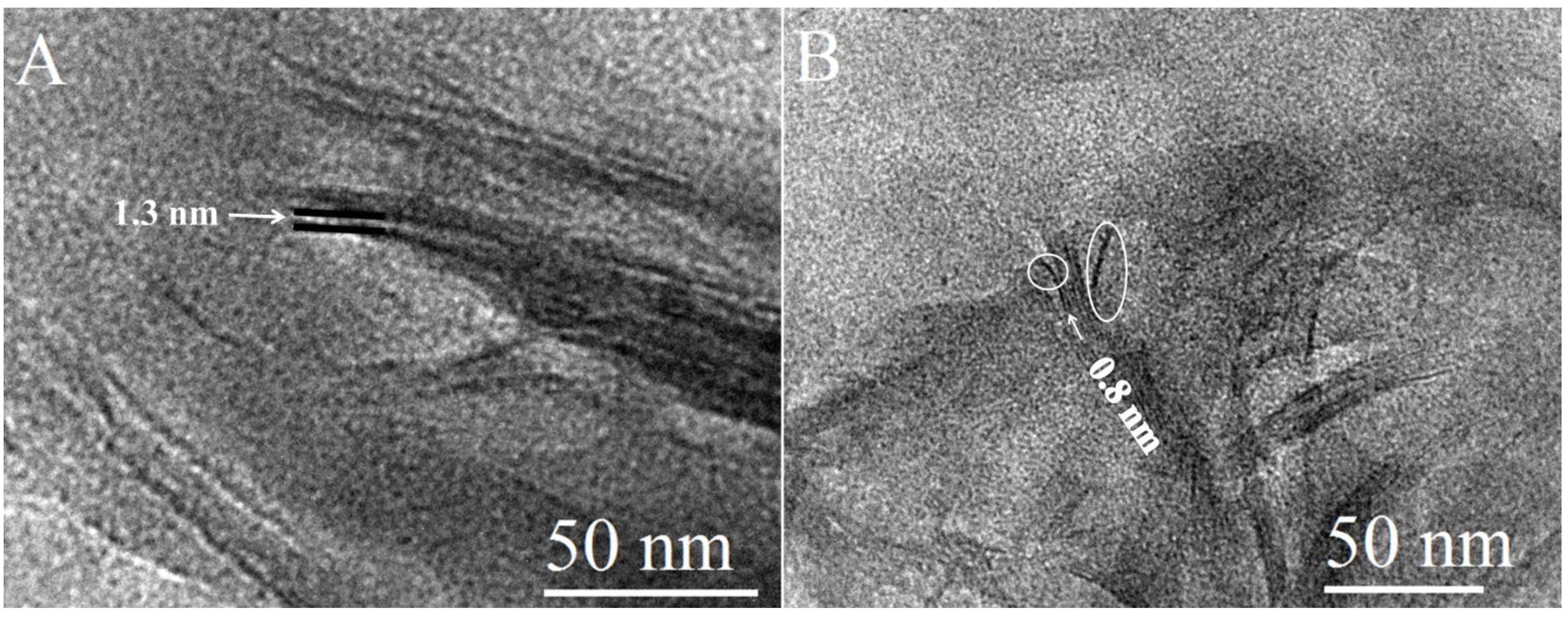 The images of NG-MMT 6:1 (Figure 5) also depicted those of a nanocomposite composed of small stacks of intercalated clay layers, in this case, in domains ranging from 10 nm to 30 nm. The interlayer spacing ranged from 0.8 nm to 1.3 nm, in agreement with XRD results. Notably, NG-MMT 6:1 displayed the detachment of an individual clay layer from a smaller stack (circled). Interestingly enough, the separation of stacks was observed in the case of NG-MMT 3:1 (Figure 4B), and when the concentration of polymer was increased, as in the case of NG-MMT 6:1, the detachment of single clay layers from a stack was observed (Figure 5B).