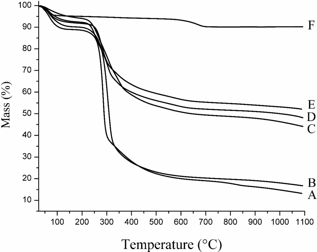 TG traces of (A) CG; (B) NG; (C) NG-MMT 6:1; (D) NG-MMT 3:1; (E) CG-MMT 3:1; and (F) Na+ MMT.