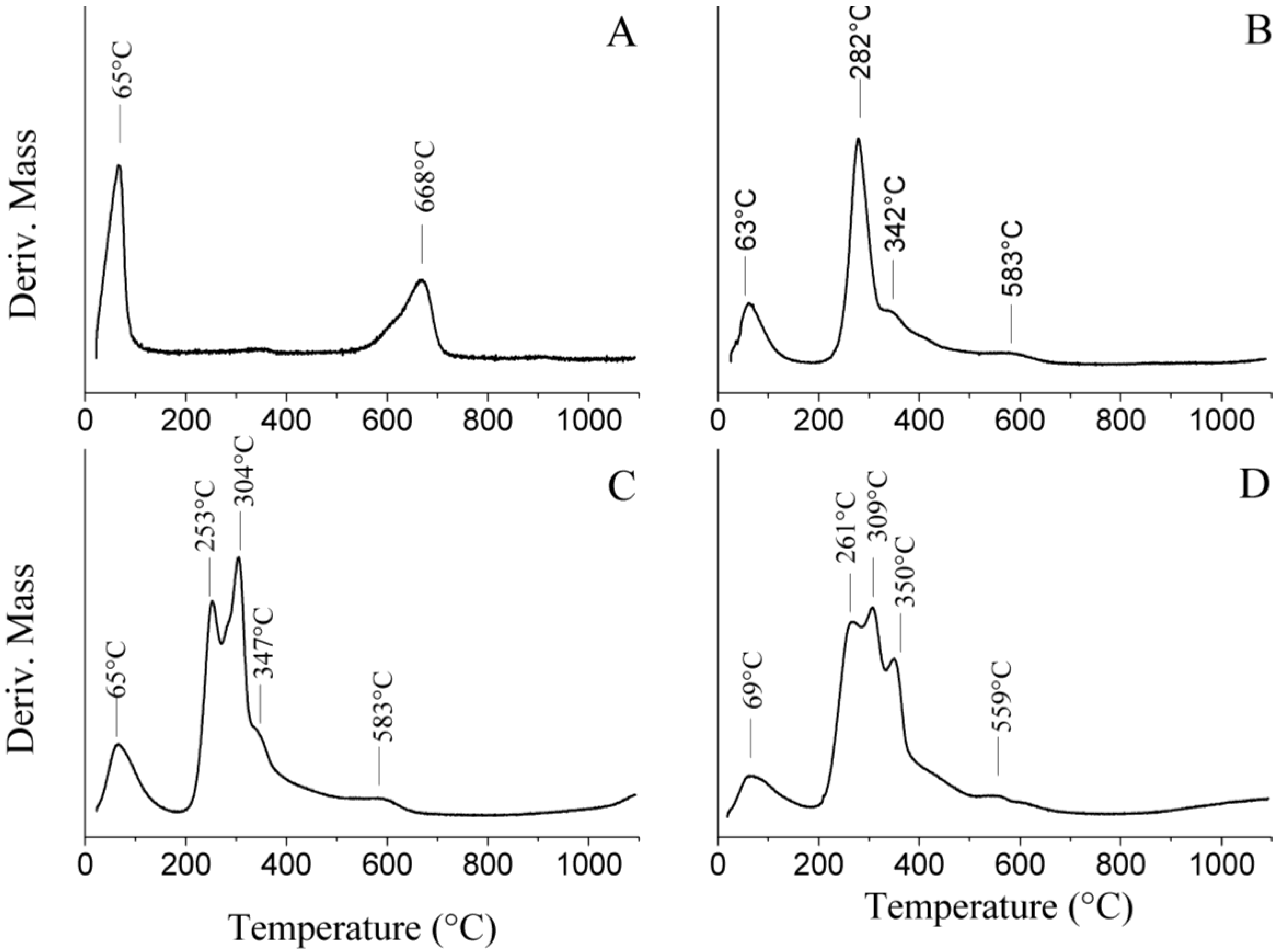 Differential thermal gravimetric (DTG) traces of (A) Na+ MMT; (B) CG-MMT 3:1; (C) NG-MMT 3:1; and (D) NG-MMT 6:1.