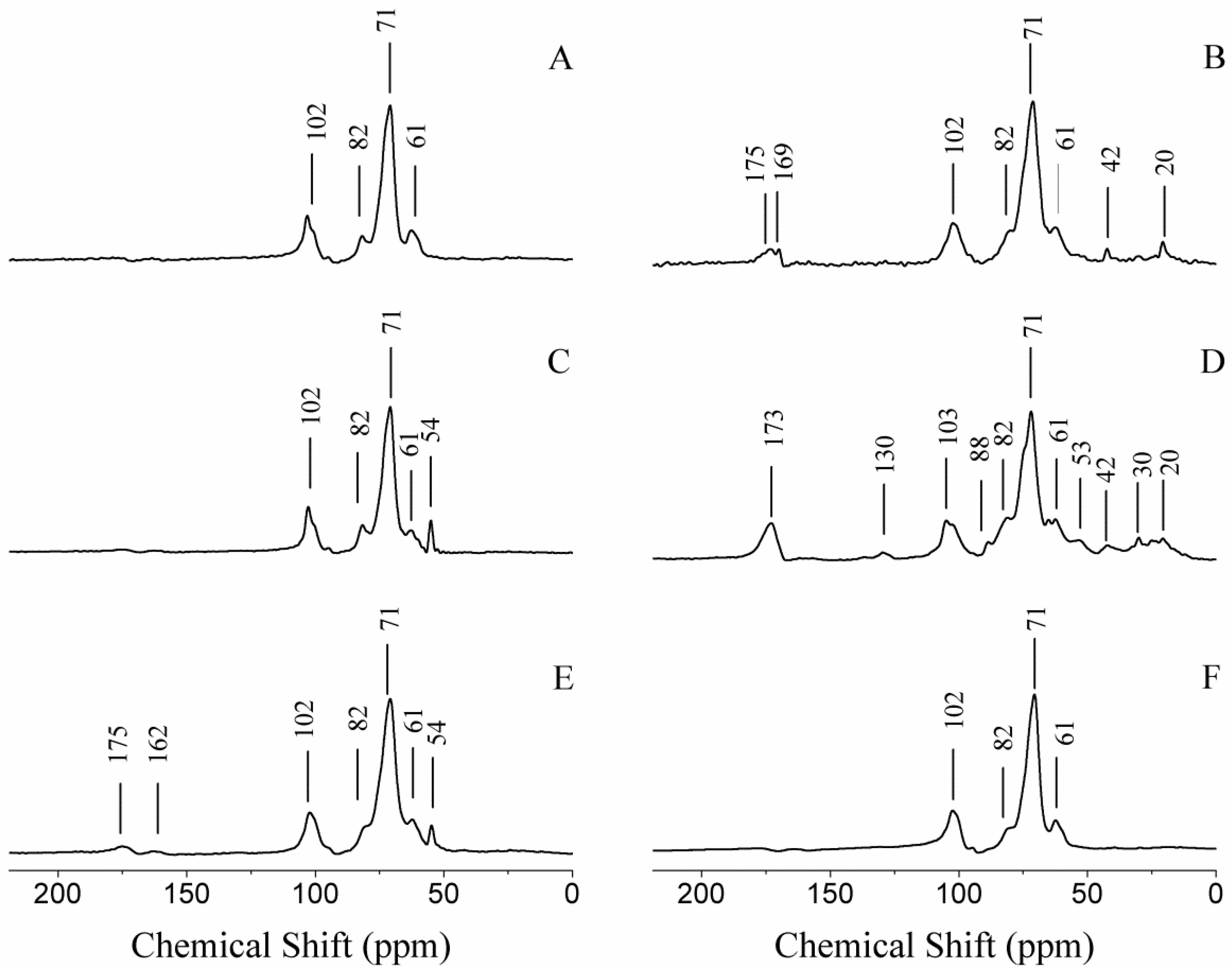 13C CP/MAS NMR spectra of (A) NG; (B) NG-MMT 3:1; (C) CG; (D) NG-MMT 6:1; (E) CG-MMT 3:1; and (F) NG Control.