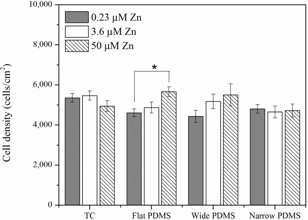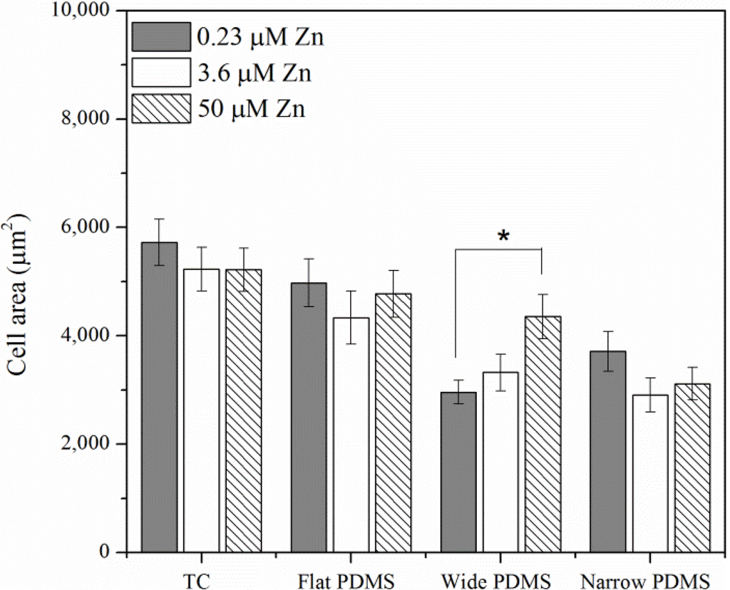At twenty-four hours post-plating, area coverage of MC3T3-E1 pre-osteoblasts in general was similar on both tissue culture polystyrene (TC) and polydimethylsiloxane (PDMS) (Figure 1). The only statistically significant increase in cell density was observed when cells were cultured on the flat PDMS at the highest zinc concentration (50 µM). A similar effect, although not statistically significant (p = 0.5), was also observed for cells on wide PDMS patterns (Figure 1). In contrast, cell coverage on the other substrates was not affected by exogenous zinc levels.