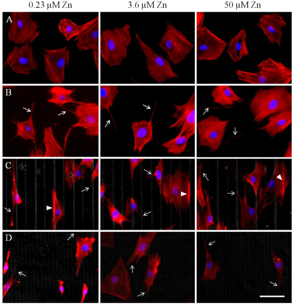 Immunofluorescence micrographs of F-Actin (visualized in the red channel) 24 h after seeding at various zinc concentrations on (A) tissue culture polystyrene (TC); (B) flat polydimethylsiloxane (PDMS); (C) wide PDMS pattern; and (D) narrow PDMS pattern. Nuclei are visualized in the blue channel. Arrows indicate discrete lamellipodia protrusions while arrowheads in (C) indicate actin clustering on the edge of a micropattern. Bar = 50 µm.