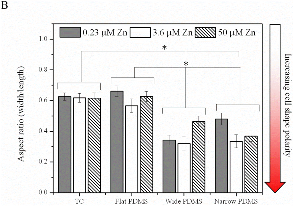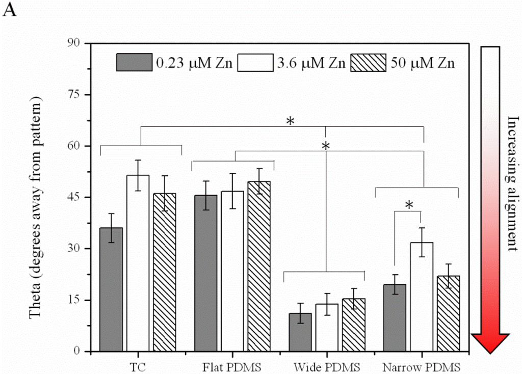 The orientation of the actin cytoskeleton was strongly correlated with the type of substrate and topography (Figure 4A). On the wide PDMS micropatterns (20/30 µm), the actin fibers were most clearly aligned (low theta values) with respect to the longitudinal direction of the pattern (Figure 2C and Figure 4A), whereas those on the narrow PDMS micropatterns (2/10 µm) were not as aligned (higher theta values), as several cells were observed to be oriented diagonally (Figure 2D and Figure 4A). Additionally, actin seemed to cluster on the edges of the wide pattern (arrowheads in Figure 2C). On TC and flat PDMS, the actin fibers were not aligned in any particular orientation, as would be expected for a non-patterned surface (Figure 2A,B and Figure 4A). Cells on both TC and flat PDMS were also elongated to a similar extent (Figure 4B), but with no statistical differences between substrate type or zinc level.