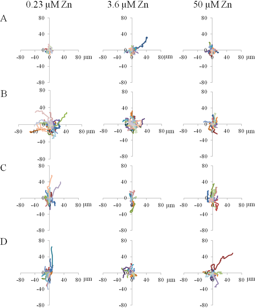 To capture the migration behavior of cells on the optically transparent substrates, cells were first seeded at 10,000 cells/cm2 and incubated at 37 °C for 2 h to allow complete attachment. The medium was then replaced with CO2-independent medium (supplemented with 10% FBS, 1% penicillin/streptomycin, and 1% L-glutamine, plus zinc additions) and cells were maintained on a 37 °C heated stage. Phase contrast micrographs were captured at 3 min intervals with a CCD camera attached to the microscope, for a total duration of 2 h. ImageJ software was used to calculate migration speeds and displacement using a manual tracking plugin.