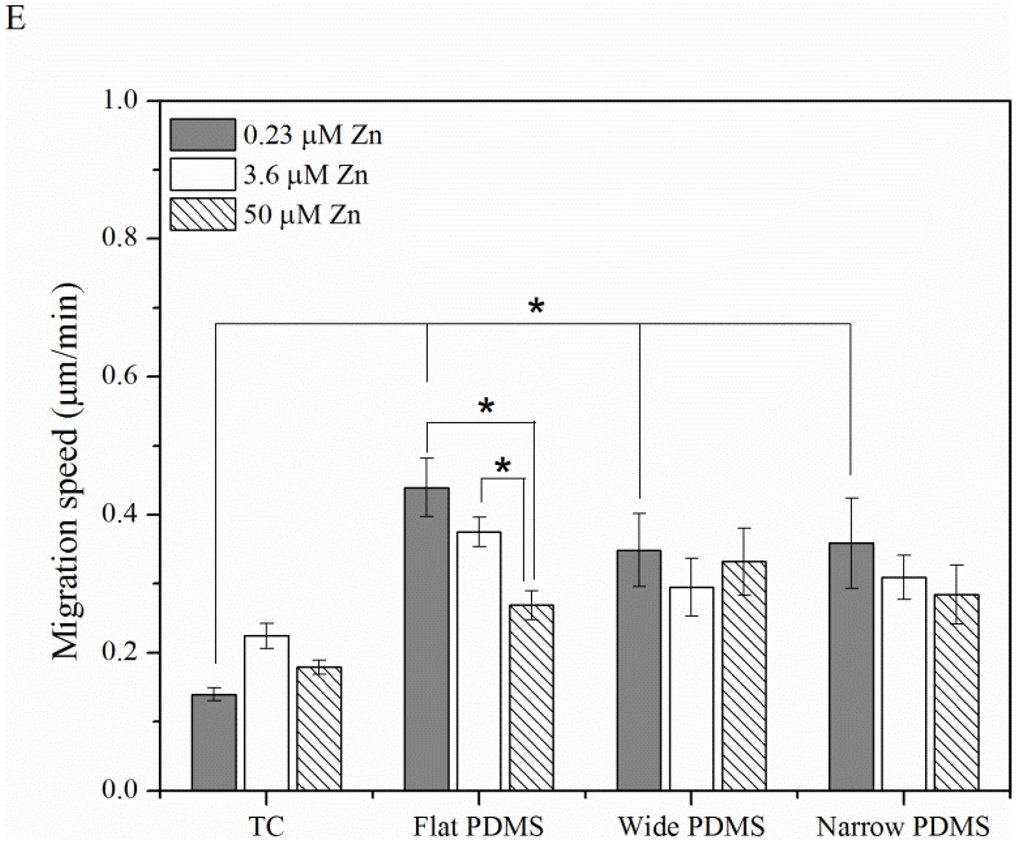 In general, cell migration was noticeably slowest on TC (0.14–0.22 µm/min) and was not found to be dependent on zinc (Figure 5E). In contrast, cell migration on flat PDMS was considerably faster (0.27–0.44 µm/min) and showed a steady decrease with increasing zinc concentration (Figure 5E). The migratory behavior of MC3T3-E1 cells on flat PDMS is similar to previous reports on breast cancer cells, where the addition of exogenous zinc also attenuated migration [39,40]. Motility of cells on both wide (0.29–0.34 µm/min) and narrow (0.28–0.36 µm/min) PDMS patterns was similar to that on flat PDMS, however zinc concentration did not have a significant effect (Figure 5E; p = 0.35–0.86). Under zinc-deprived (0.23 µM) and serum-level zinc (3.6 µM) conditions, migration on patterned PDMS was reduced compared to flat PDMS, but this reduction was also not significant (p = 0.11–0.74). Under zinc-rich conditions (50 µM), migration speed did not vary much at all among the three PDMS surfaces. This suggests that cells are less responsive to substrate microtopography when zinc is abundant.
