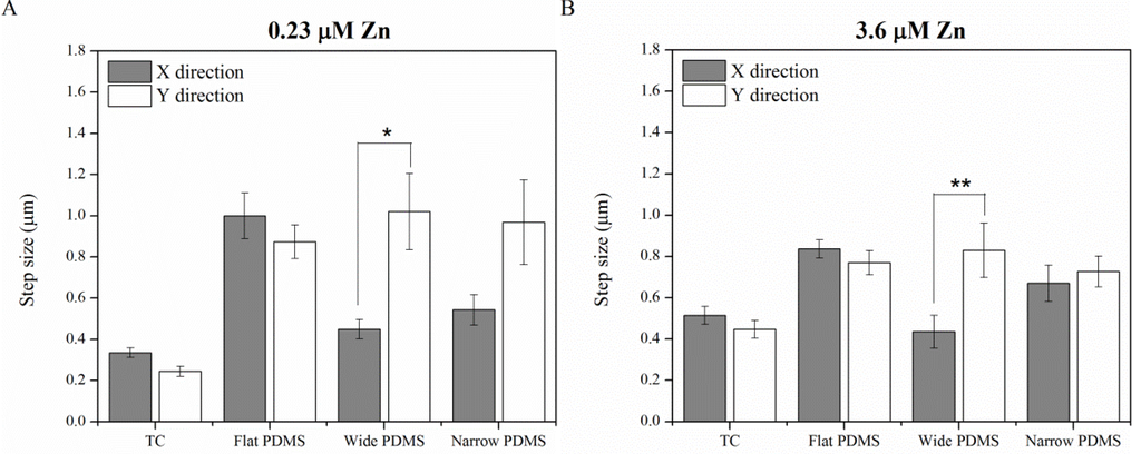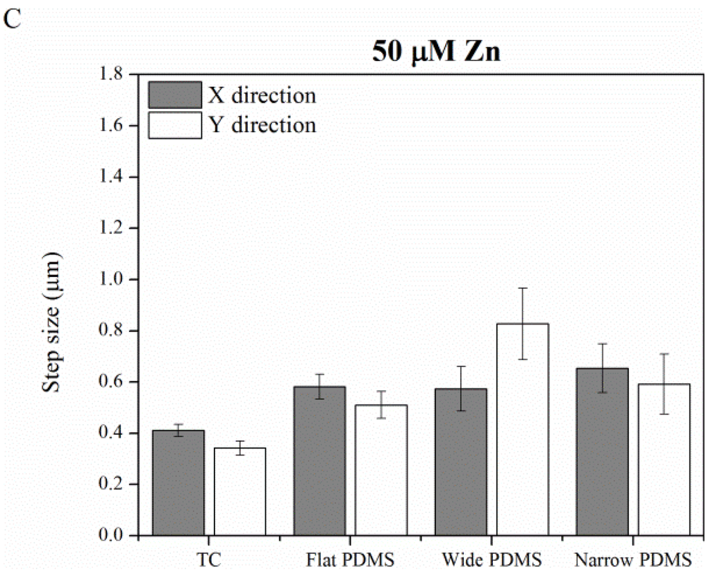 At all concentrations of zinc, noticeable differences in cell step size, as well as distinction between step direction in x and y, were seen (Figure 6). At 0.23 µM zinc (zinc-deprived) cells on wide patterned PDMS demonstrated a statistically significant preference for migrating in the y direction, along the lengths of the PDMS ridges (Figure 6A). Cells on narrow patterned PDMS also exhibited a slight preference for migrating along the ridges, but not at a significant level (p = 0.064). For cells on TC and flat PDMS there was no preference for either direction. At 3.6 µM zinc (serum-level) only cells on the wide PDMS pattern retained their predilection for migration along the ridges, whereas cells on the narrow PDMS pattern behaved as if they were on flat PDMS (Figure 6B). At even higher zinc concentration (50 µM), step size was not significantly different in x or y direction for cells on all surfaces (Figure 6C).