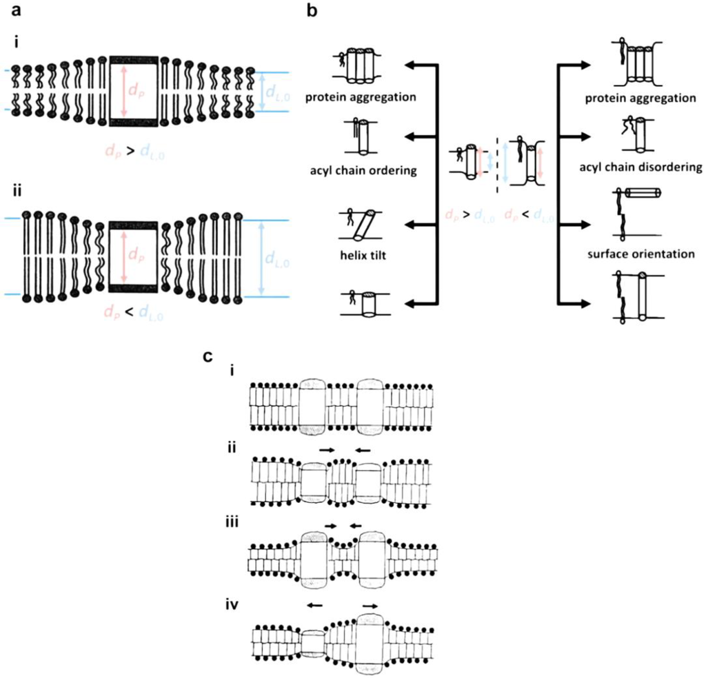 Hydrophobic mismatch is the difference in hydrophobic length between amphiphilic molecules (dL,0) and proteins (dP,0). It is a primary determinant of the function and stability of the integral membrane proteins. In general, dP = dP,0 is a good assumption because compressibility of proteins is two to three orders of magnitude higher than that of lipids [60]. Two possible hydrophobic mismatches are shown in Figure 5a: (i) dP > dL,0; (ii) dP < dL,0. As shown in the schematic, size differences may induce stretching or compression of both membrane and protein to minimize the excess free energy [53]: