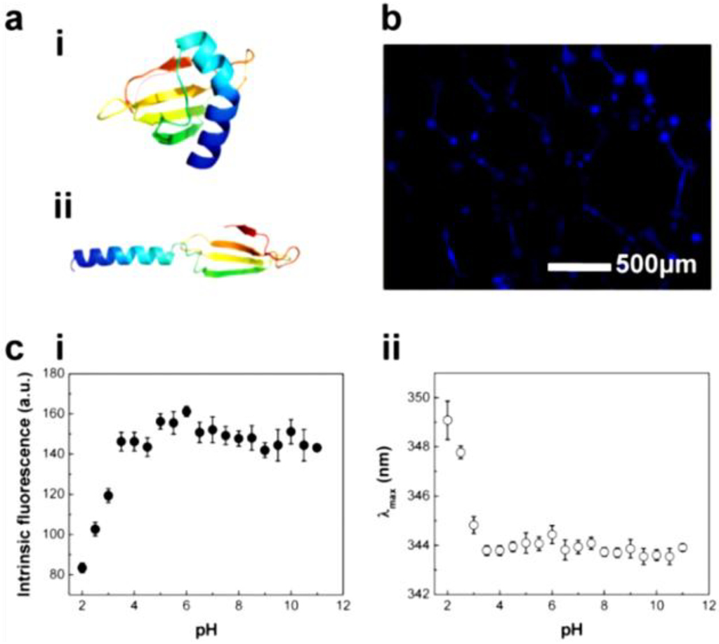 (a) Ranaspumin (RSN)-2 conformation: (i) globular and (ii) extended form (adapted with permission from [128]. Copyright 2010 Elsevier); (b) Fluorescence microscopy image of fluorescamine-labeled RSN-2 foam; (c) Intrinsic fluorescence of RSN-2 foams: (i) maximum emission intensity and (ii) maximum emission wavelength (λmax); (d) The effects of pH on the characteristics of RSN-2 foam: (i) foamability and (ii) foam stability. (c,d) reprinted with permission from [127]. (Copyright 2013 IOP Publishing)