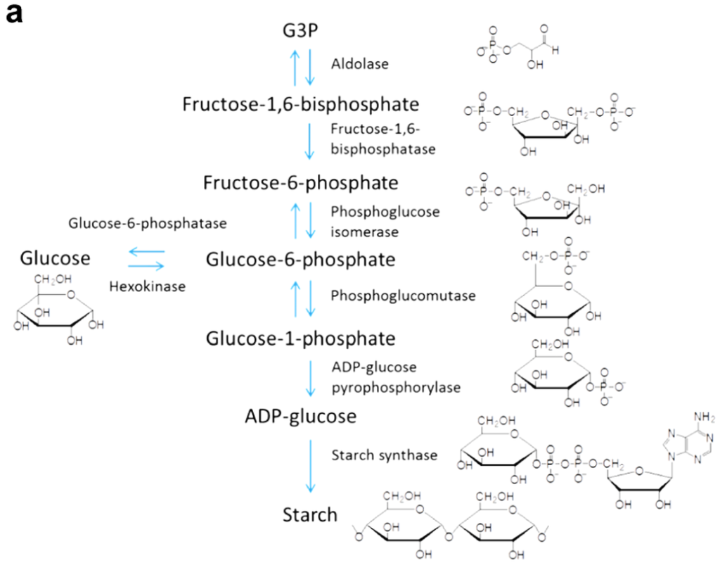 As shown in Figure 13, carbon dioxide fixation is catalyzed by a 5-carbon ribulose biphosphate carboxylate (Rubisco), forming a 6-carbon molecule [153]. This molecule splits into two phosphoglycerate (PGA), which are reduced to form G3P; G3P molecules are used to synthesize carbohydrates such as fructose, glucose, sucrose, and starch, which can be converted to biofuel (conversion methods are reviewed in [154,155,156,157,158]). Metabolic pathways for G3P to starch and G3P to sucrose are shown in Figure 14a,b, respectively.