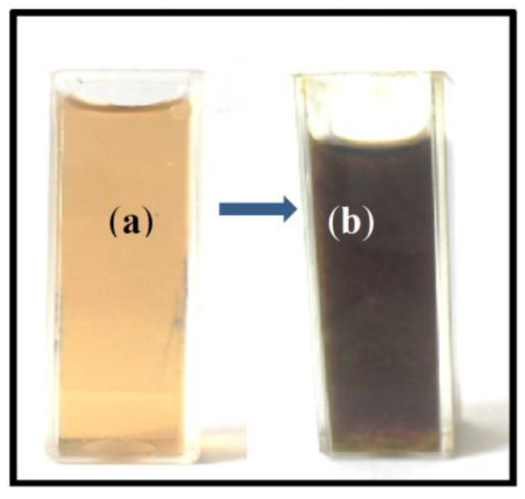 The formation of silver nanoparticles was confirmed through visual assessment. The reaction mixture turned to dark brown color from brownish-yellow color within 20 min indicated the synthesis of silver nanoparticles (Figure 1). The appearance of dark brown color may be due to the excitation of surface plasmon resonance (SPR) effect and reduction of AgNO3 [30].