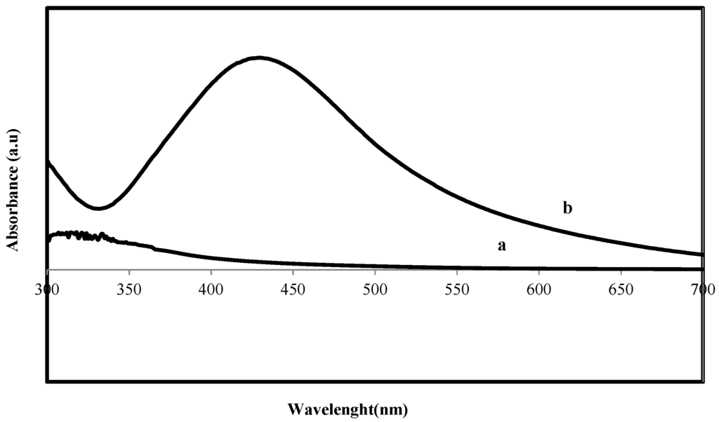 UV–Vis spectrum of reaction mixture at different wavelengths ranging from 300 to 700 nm showed strong absorption peak with centering at 420 nm (Figure 2) indicated the formation of Ag-NPs. This absorption is close to that seen for silver nanoparticles formed by different methods [31]. The wide absorption peak may be induced by the wide size distribution of Ag nanoparticles.