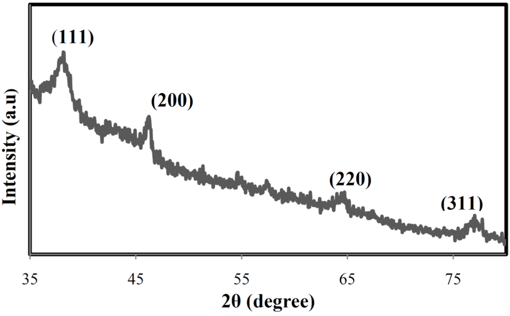 The XRD pattern (Figure 4) shows that the particles are crystalline with small size. The lattice planes (111), (200), (220), and (311) were identified with the corresponding Bragg’s angles of 37.95°, 45.84°, 64.07°, and 76.43°, respectively, which confirm the face-centered cubic structure of the formed Ag-NPs. The size of formed silver nanoparticles was estimated by using Scherrer’s equation [35] by determining the width of the (111) Bragg reflection and was calculated to be around 8 nm.