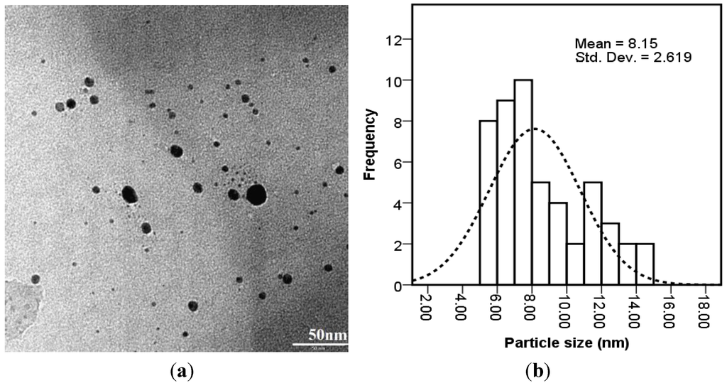 The (a) TEM micrograph; and (b) particle size distributions of bio-synthesized Ag-NPs.