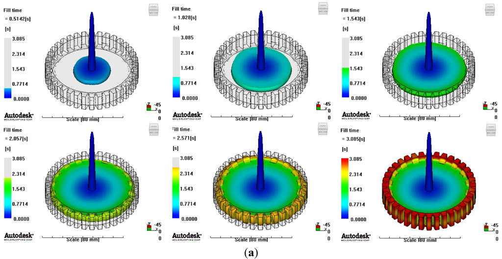 The designed plastic worm wheel involves two steps of injection molding, as in Figure 4a. In the first injection molding, the tooth profile part—the gear ring—is molded; the central area of the gearing is removed through the cutting process, and then the worm wheel frame is molded through the second injection molding in which the metal bush combined with the rotation axis and the gear ring produced in the first injection are applied to the insert. This is the general process of making a plastic worm wheel in this study. Figure 4b shows the core and molding plan of the first and second injection molding steps in producing a plastic worm wheel. As the materials applied to the plastic worm wheel in this study include glass fiber reinforcement to secure sufficient strength, the orientation characteristic of the glass fiber reinforcement in reflection of the resin flow are shown. In addition, as the weld mark is likely to weaken the local hardness, the gate location needs to be carefully selected in consideration of the molded part’s function. As for the designed plastic worm wheel, the gate may be put at the center of the wheel or the sides where the tooth profile is located. As the gate is located at the side of the product or the molded part, it may be advantageous regarding the number of cavities, which is related to productivity, but disadvantageous at the same time in that the weld mark is formed at the gear tooth profile part and the glass fiber reinforcement orientation properties become disadvantageous to the worm wheel driving. Thus, this study adopts the top-gate type, as in Figure 4, to secure fiber orientation properties for the load applied to the gear tooth profile. In addition, this prevents the weld line from being formed at the gear tooth profile part.