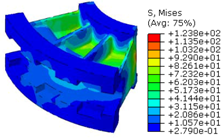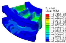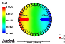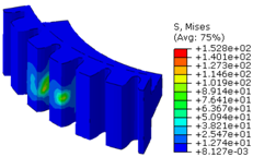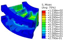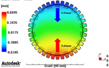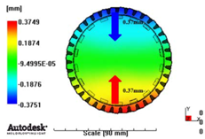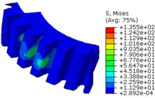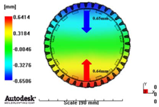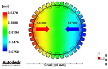 Figure 7 and Figure 8 show the prediction results of glass fiber principal direction orientation according to the contents of glass fiber reinforcement. If the red color shaded part in the skin layer is large in the analysis result of fiber orientation, it means that the many glass fibers are oriented to the principal direction and the area of loaded. In reference to the fiber orientation analysis, the fiber principal direction orientation of tooth part in the skin layer is large in the PA66 resin with glass fiber reinforcement content of 25% because the resin fluid in the case of glass fiber reinforcement content of 50% cannot make relatively good progress. However, all cases have poor distribution of glass fiber in the part of the dedendum circle. This result means that the tooth root part of worm wheel may be vulnerable to the force applied to worm wheel teeth compared with the pitch surface part. As to the deformation analysis in connection with the measurement accuracy of the final molded part, the spur and helical gear rings showed the same level of deformation (Table 6).