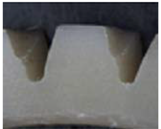 The difference in wheel backlash according to glass fiber reinforcement content is shown in the surface images of the gear tooth profile in Figure 12. As in the graph in Figure 11, the operation of the worm wheel of 25 wt % glass fiber reinforcement content caused wheel backlash to a relatively large degree after the 50,000th operation, which is also indicated in Figure 9 and shows the extent of the surface crack at the gear tooth profile after the 50,000th operation. Thus, in the durability evaluation, it turned out that worm wheels with glass fiber reinforcement are advantageous compared to those of high-viscosity resin, and that worm wheels of 50 wt % glass fiber reinforcement content are the most advantageous in terms of durability.