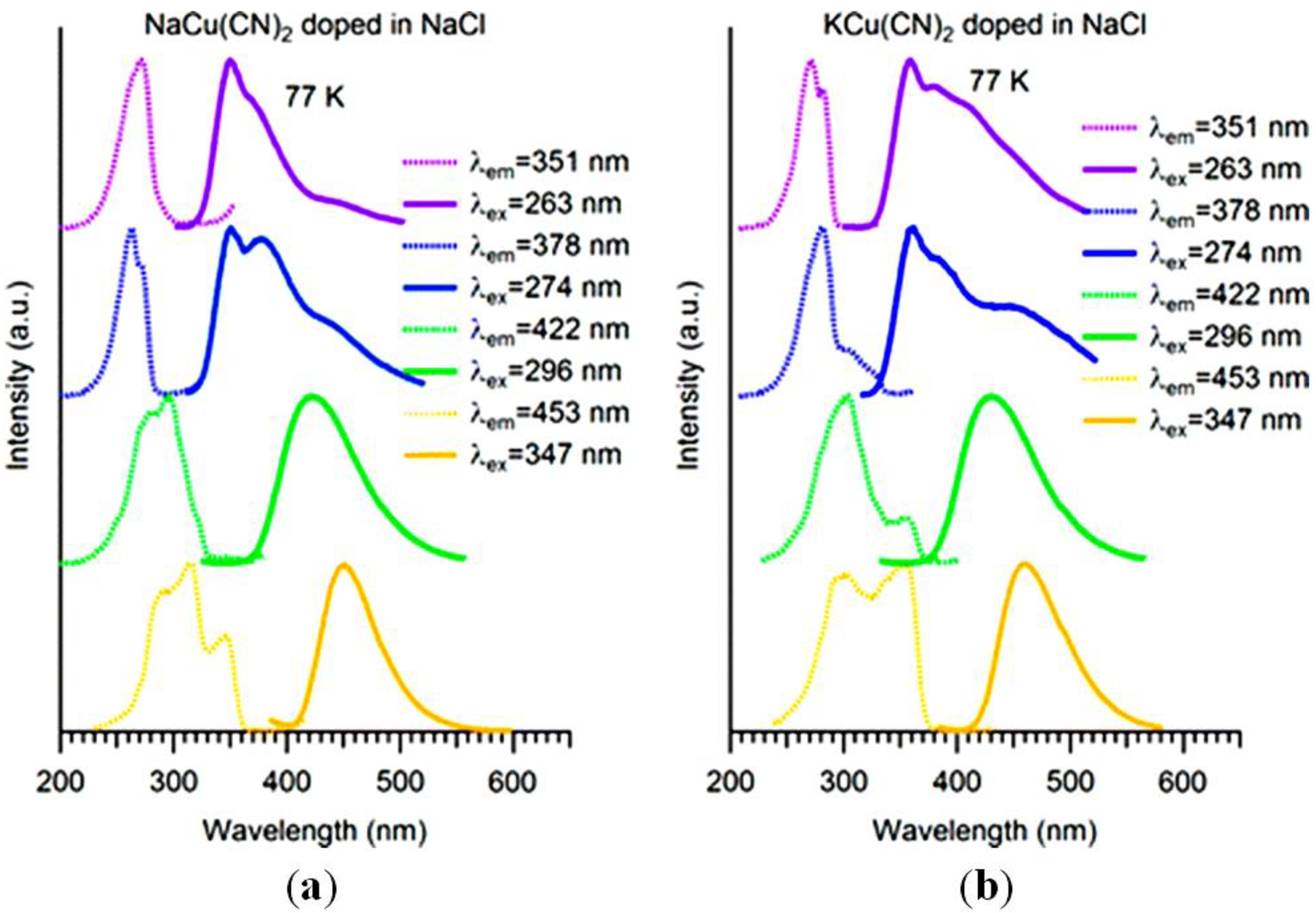 2− in doped hosts. Other alkali halides, such as NaBr and KBr, were also used and the result was that all the crystals have exciplex tuning. For each host, both NaCu(CN)