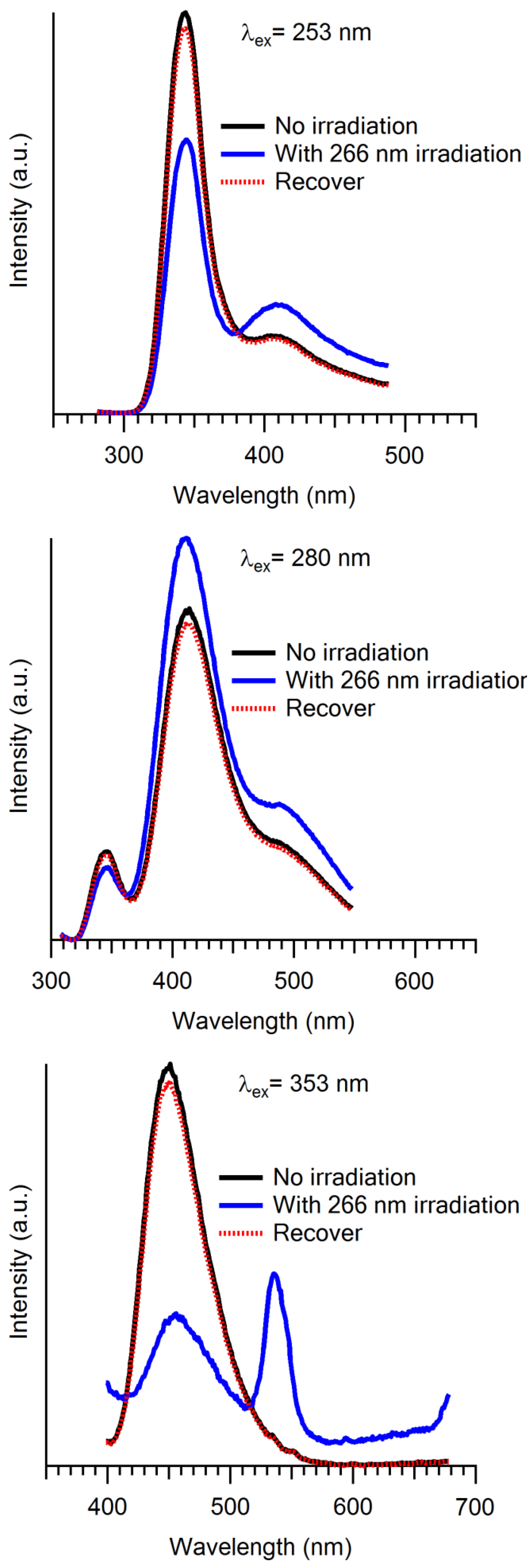 2− doped in KBr at 77 K without laser irradiation (black solid), with 266 nm laser irradiation (blue solid), and recover, e.g., heat to room temperature then cool down to 77 K without laser irradiation (red dashed). (Reprinted with permission from [