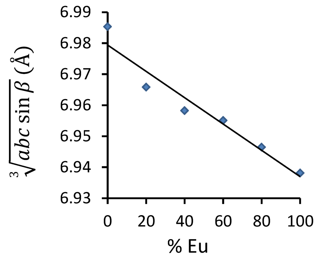 Herein, all peaks could be attributed to singe phase SrSiS. This phase is very similar to EuSiS, studied in detail by Hartenbach et al. [33]. Therefore, we use the structural parameters of EuSiS as a starting point for the refinement of EuSrSiS. The lattice parameters decrease quasi-linearly when going from x = 0 to x = 1, the fully substituted EuSiS. In Figure 2, this is illustrated with a plot of the cube root of the monoclinic cell volume ().