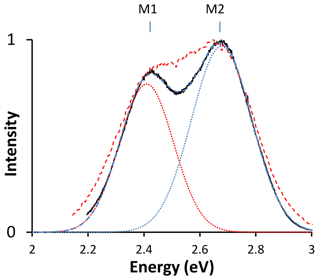 The spectrum shows that only one Sr-site, probably Sr1—based on the structural arguments above and the Dorenbos model below—is substantially occupied by cerium. Indeed, if the second site would also be occupied, we would expect a second pair of emission peaks, shifted toward higher energies. Therefore, we conclude that there is almost no Ce on the Sr2-site or the emission from this site is seriously hampered.