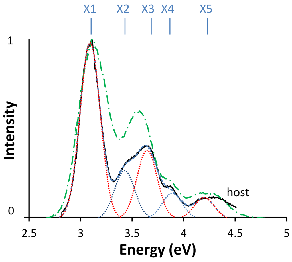 At least four distinct peaks can be discerned in the spectrum measured at room temperature. To confirm if (and which) one of the peaks is composed of more components, a measurement at 10 K was performed. This revealed that the second peak, found to be around 3.65 eV at room temperature, consists of two bands, at 3.43 eV and 3.64 eV. The peak on the high energy end of the excitation spectrum is relatively broad and also seems to be complex. In order to clarify this, a diffuse reflection measurement was carried out (spectrum not shown). The onset of the host absorption is found around 4.35 eV (285 nm). Therefore, we attribute the high energy part of this peak to host absorption.