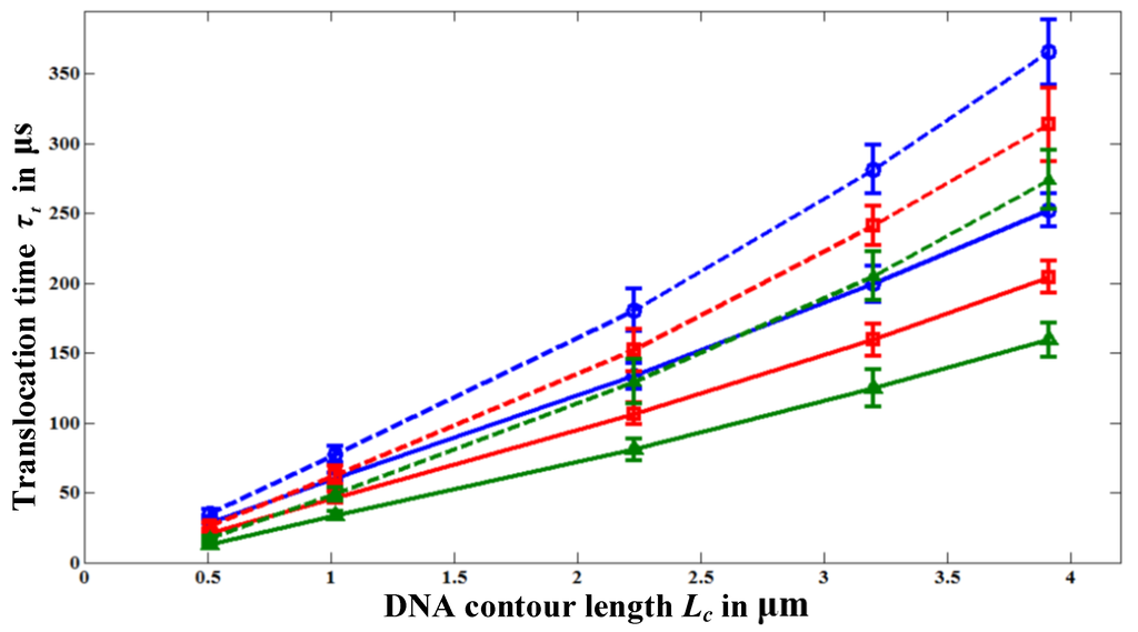 21] studied the effect of fluid temperature, KCl concentration, viscosity, and the electrical bias voltage on the translocation speed of a DNA molecule inside a Si