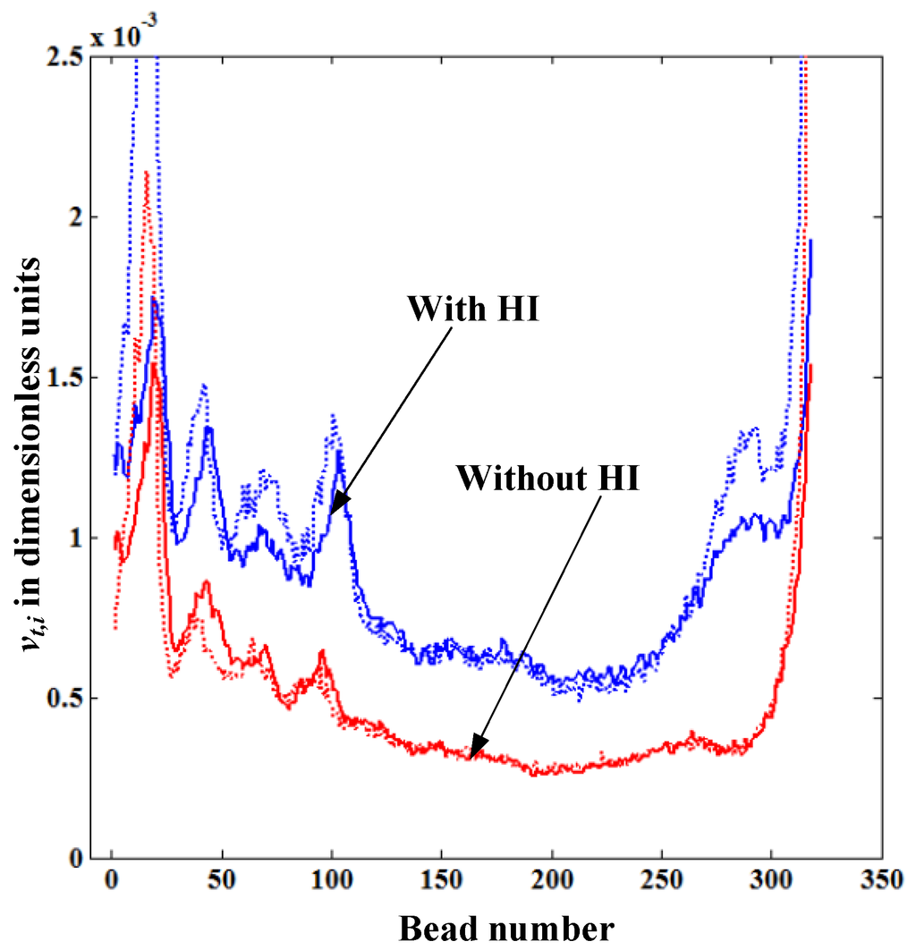 vt,i given from the solution of LD equations and that obtained from the theoretical formula Equation (5), both with and without HI. In both cases, the simulation begins with the same initial random configuration. The dotted lines in