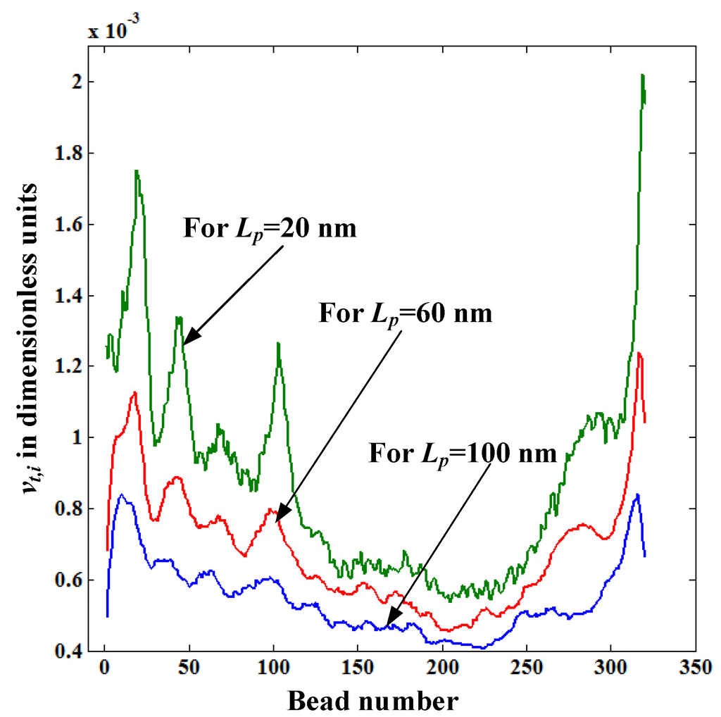 Variation of the translocation velocity of each bead vt,i inside the nanopore for pore lengths Lp = 20, 60, and 100 nm.