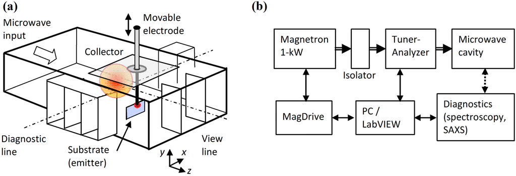 The experimental setup: (a) The microwave cavity with a movable electrode directing the localized microwaves into the substrate, thus creating a hotspot from which the fireball is ejected to the air atmosphere within the cavity; and (b) A block diagram of the experimental instrumentation.