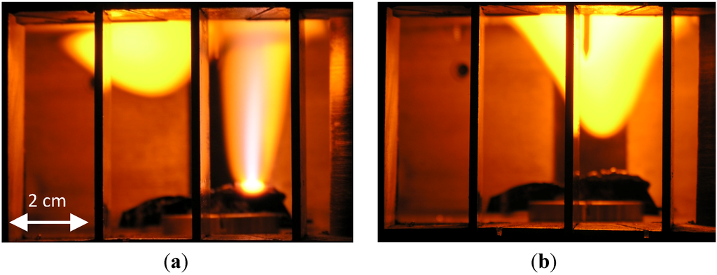 The hotspot evolves at the contact point between the movable electrode and the substrate (Figure 1a) by a thermal-runaway process [20,21]. This localized-heating effect leads to melting of the substrate in a ~1 mm region near the electrode. Further heating of the hotspot results in evaporation and ionization of the substrate material. A fire column is ejected from the hotspot, and evolves as a buoyant luminous body floating stably in the air in a self-organized manner [1,22]. Typical images of a fire-column associated with a fireball and of a sole floating fireball are presented in Figure 2a,b, respectively.