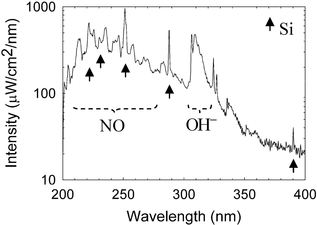 Optical spectroscopy measurements. A typical spectrum of silicon plasmoid reveals silicon excited atoms, and hydroxyl and nitric oxide radical production.